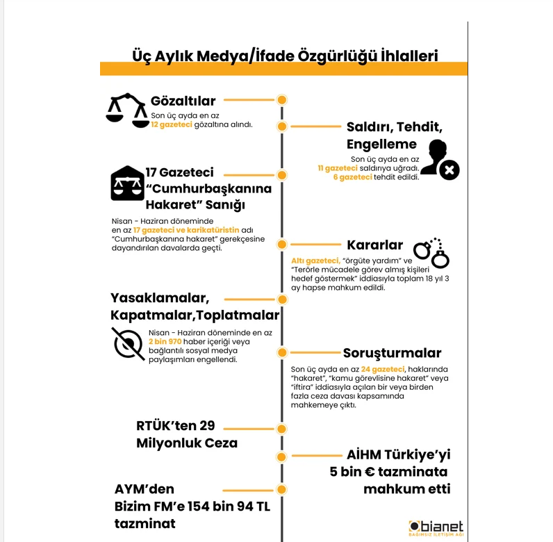 Nisan-Haziran dönemini kapsayan BİA Medya Gözlem Raporu, üç ayda yaklaşık 200 gazetecinin yıllardır dizginlenemeyen yargı baskısı altında mahkemeye çıkarıldığı, “iktidarın sopası” RTÜK’ün 29 milyon 205 bin 625 TL’lik para cezası kestiği, iktidar ortağı MHP ve çevresinin özellikle Sinan Ateş cinayetinin peşini bırakmayan araştırmacı gazetecileri yargının izleyici kaldığı endişe verici bir ortamda pervasızca tehdit ettiği kara bir tabloya işaret ediyor.