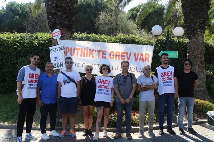 Sputnik'in Türkiye Bürosu'nda çalışanların hak talepli eylemi 39’uncu gününde Şişli’de bulunan grev alanında devam ediyor. Dicle Fırat Gazeteciler Derneği (DFG) Eşbaşkanı Serdar Altan ile derneğin yöneticisi Mehmet Ali Ertaş, grevdeki çalışanlara destek ziyaretinde bulundu. Sputnik İşyeri Temsilcisi Nejdet Eksilmez ile Sputnik çalışanları, Altan ve Ertaş'ı karşıladı.