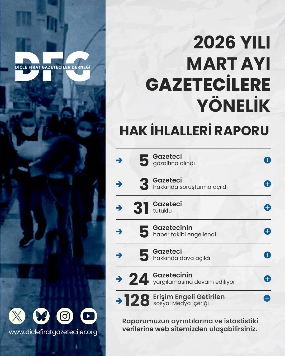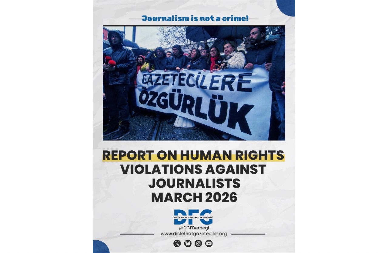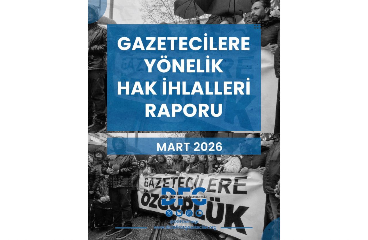 Dicle Fırat Gazeteciler Derneği (DFG) Gazetecilere Yönelik Mart Ayı Hak İhlalleri Raporu’nu yayınladı. Mart ayının, Türkiye’de basın ve ifade özgürlüğü açısından kaygı verici gelişmelerin yoğunlaştığı bir dönem olarak öne çıkıldığına dikkat çekilen raporda, “Demokratikleşme yönünde adımların beklendiği bir süreçte, gazetecilere yönelik hak ihlallerinin artarak devam etmesi, basın özgürlüğünün yapısal bir baskı altında olduğunu göstermektedir. Nitekim Şubat ayında 6 gazetecinin tutuklanmasının ardından, Mart ayında da 5 gazeteci gözaltına alınmış ve 2 gazeteci yaptıkları haberler gerekçe gösterilerek tutuklanmıştır” denildi.