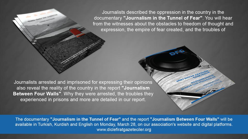 Dicle Fırat Gazeteciler Derneği (DFG), yürüttükleri 4 aylık bir çalışma sonucu hazırladıkları "Korku Tünelinde Gazetecilik" belgeseli ve "Dört Duvar Arasında Gazetecilik" raporunu tamamladı. Hem belgesel, hem de rapor, 28 Mart Pazartesi günü derneğin internet sitesi ve dijital platformlarından yayınlanacak.