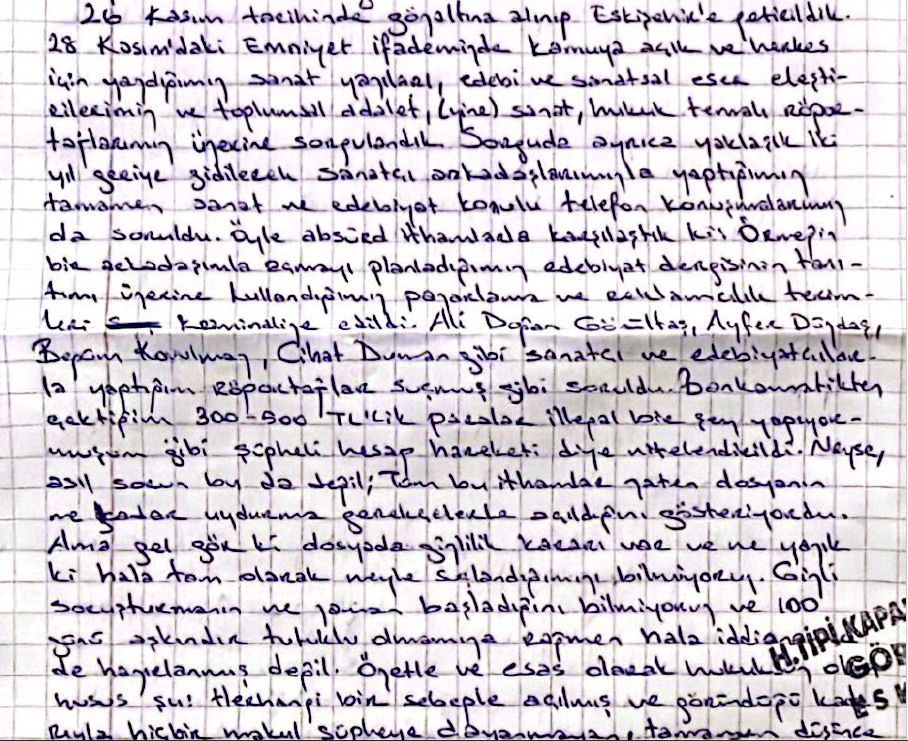 Bir meslektaşı ile kurmak istedikleri edebiyat dergisinin reklam ve tanıtım çalışmalarının da suçlama konusu yapıldığını söyleyen Üçar, "Ali Doğan Gönültaş, Ayfer Düzdaş gibi sanatçılarla yaptığım röportajlar suç sayıldı. Dosya tamamen uydurma gerekçelerle oluşturulmuş. Dosyada gizlilik kararı olduğu için ve iddianame hazırlanmadığı için ne ile suçlandığımızı bilmiyoruz. 100 gündür rehin tutuluyorum. Somut delile dayanmayan iddialarla entelektüel ve gazetecilik faaliyetlerim suçlama konusu yapılarak 100 gündür rehin tutuluyorum. Siyasi süreç atmosferi ile tutuklu olduğumuzu biliyorum. Gazeteciler, sanatçılar ve aydınlar bu saiklerle tutuklanıyor. Herkesi duyarlı olmaya çağırıyorum" dedi.