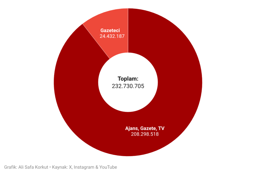 Bu hesapların paylaşımlarının toplam görüntülenme sayısı ise 232 milyon 730 bin 705. Bu görüntülenmelerin büyük çoğunluğu ise takipçi sayılarının aksine ajans, gazete ve televizyon kanallarınına ait.