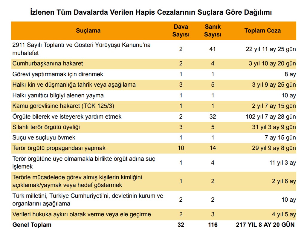 Raporun kapsadığı dönemde MLSA gözlemcilerinin 20 ilde takip ettiği 233 davada 1646 kişi yargılandı. Bu dönemde karar çıkan 32 davada, 116 sanığa 217 yıl, 8 ay, 20 gün hapis cezası verildi. Bunların arasında yer alan 17 gazetecilik davasında ise 23 gazeteci 67 yıl, 8 ay, 12 gün ay hapis cezası aldı. Karara bağlanan 6 davada, 12 sanık hakkında 75 bin 126 TL adli para cezası verilirken, 59 davada ise sanıklar hakkında beraat kararı çıktı.