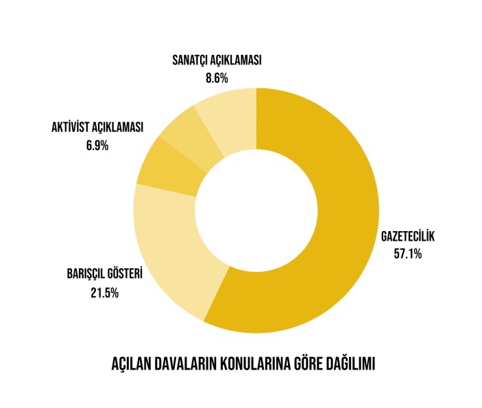 Raporun kapsadığı dönemde 314 gazeteci, davaların yüzde 66’sına denk gelen toplam 154 davada sanık olarak yargılandı. Bu davaların 133’ünü ise (yüzde 57’sini) haber yapmak, yayınlamak gibi sadece gazetecilik nedeniyle açılan davalar oluşturdu. Gazeteciler, barışçıl gösterileri haber yapmak için takip ederken gözaltına alınarak, eylemcilerle birlikte, “2911 sayılı Toplantı ve Gösteri Yürüyüşleri Kanunu’na muhalefet” iddiasıyla da yargılandı; gazetecilere yönelik davaların bir kısmı bu iddiayla açılanlar oldu.
