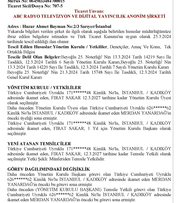 Radyo ve Televizyon Üst Kurulu'nun internet sitesinde yer alan bilgiye göre uydu yayın izni olan Tele 1 isimli kanalın yayıncısı ABC Radyo ve Televizyon Dijital Yayıncılık Anonim Şirketi. Ancak Ticaret Sicil Gazetesi kayıtlarına göre şirketin sahibi Alp Yanardağ değil, hatta Alp Yanardağ hiç bir zaman şirket yönetiminde de olmamış. 25 Nisan 2019 tarihinde Fırat Sakar tek hissedar olarak şirketi devralmış. 21 Nisan 2022 tarihinde ise Merdan Yanardağ hem tek pay sahibi olarak şirketi devralmış hem de Yönetim Kurulu Başkanlığı görevini üstlenmiş. Ancak 25 Mart 2024