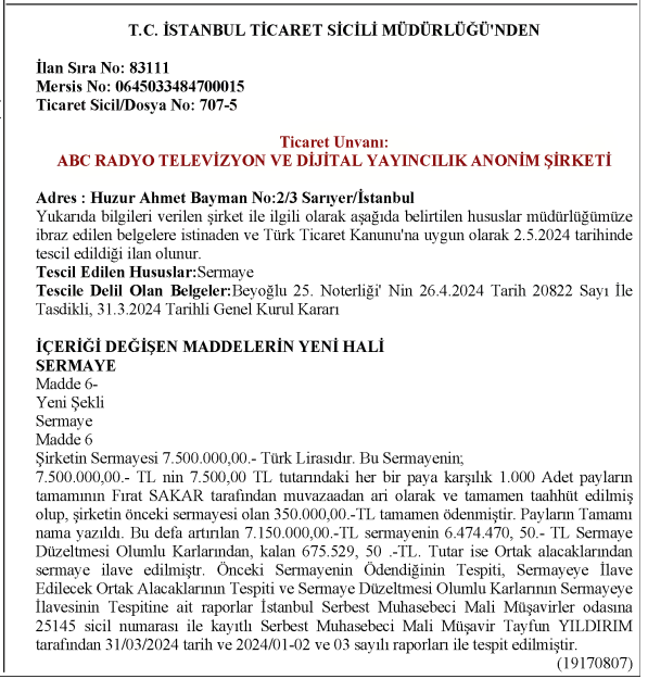 Hatta Sakar görevi devralmak ile kalmayıp 3 Mayıs 2024 tarihinde de sermaye arttırımına gitmiş. Ticaret Sicil Gazetesi kayıtlarına göre şirketin sermayesi 7,5 milyar liraya yükselmiş ve bin paydan oluşan hisselerin tümünün sahibi Fırat Sakar olmuş.